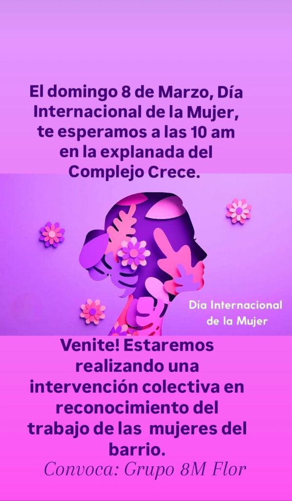En el marco del Día Internacional de la Mujer, el Colectivo 8M de Flor de Maroñas convoca a vecinas y vecinos del barrio a participar de un encuentro abierto que se realizará este domingo 8 de marzo a las 10 de la mañana, en la Plaza Flor de Maroñas, frente a la escalinata del Complejo Cultural CRECE, sobre la calle Manuel Acuña.